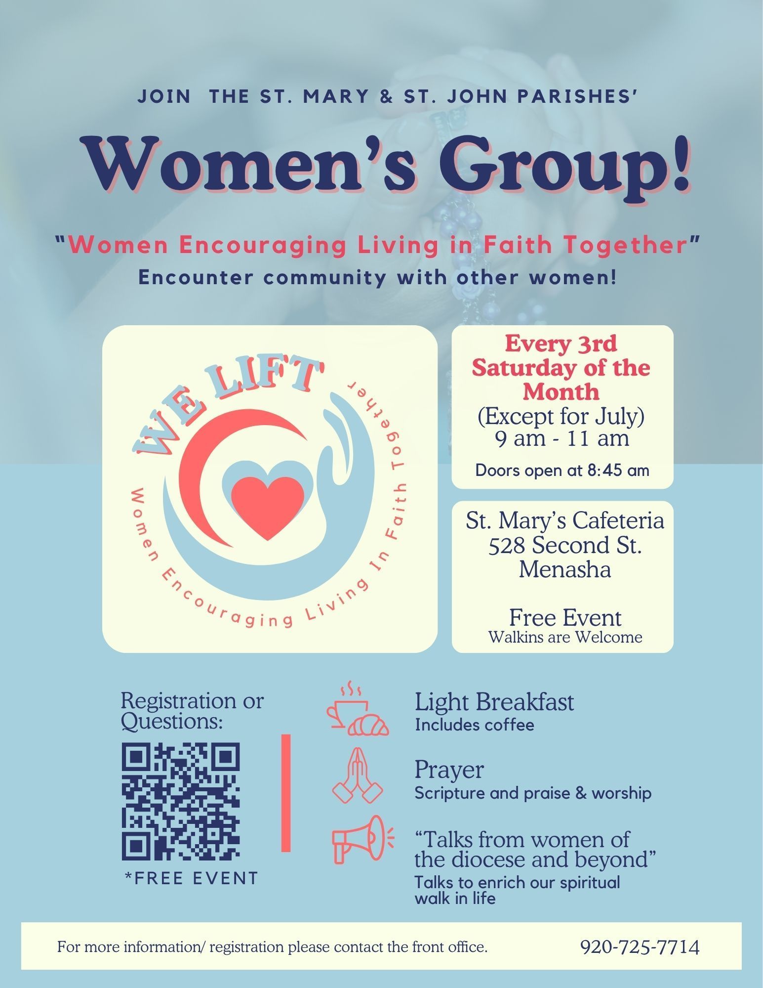 Our large group events are held on the third Saturday of each month except for July. The free event includes a speaker and discussion, Lectio Divina, praise and worship, and a light breakfast.